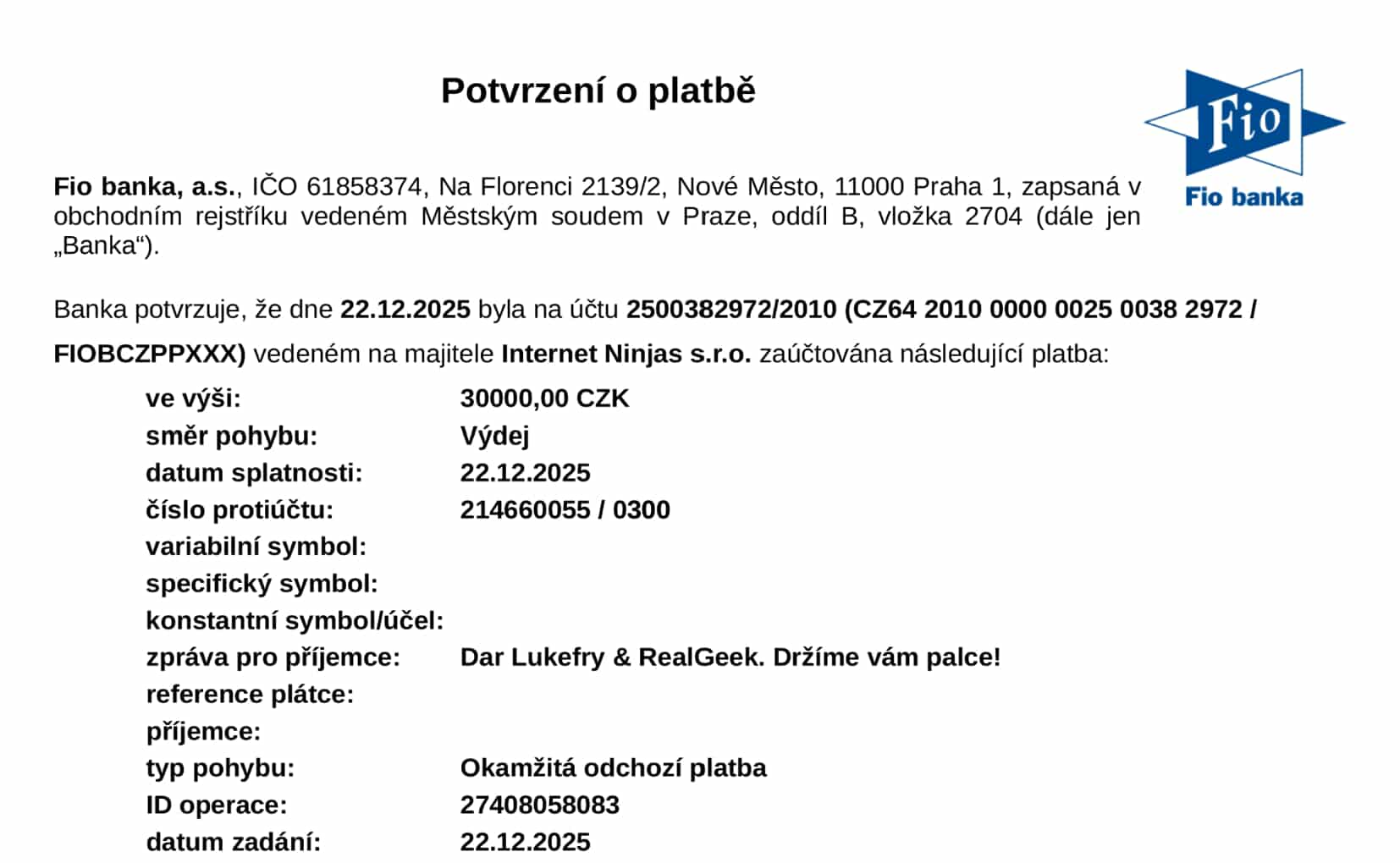 My v RealGeeku jsme se rozhodli částku zaokrouhlit a dne 22. 12. 2025 jsme Nadaci Malý Noe odeslali 30 000 Kč.